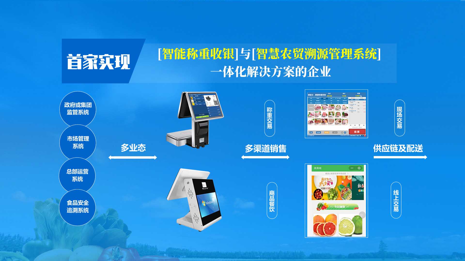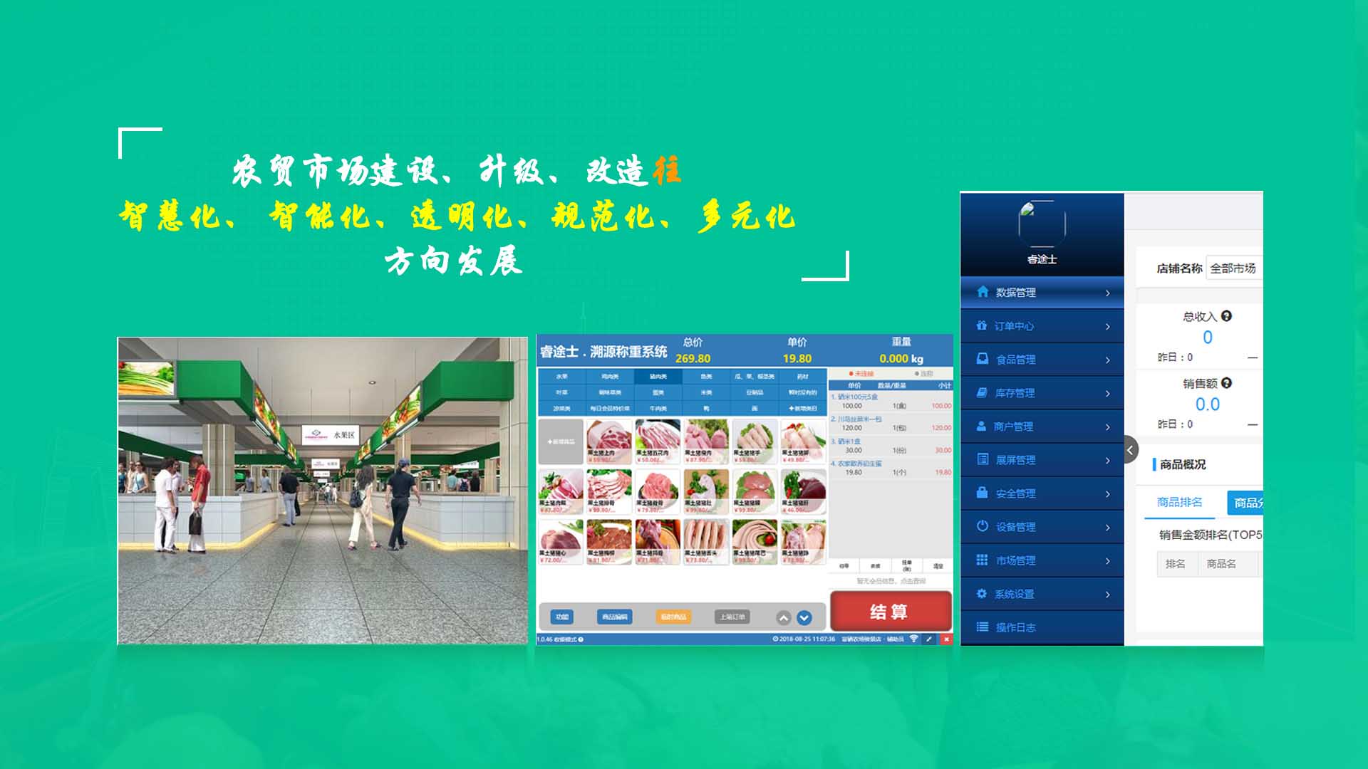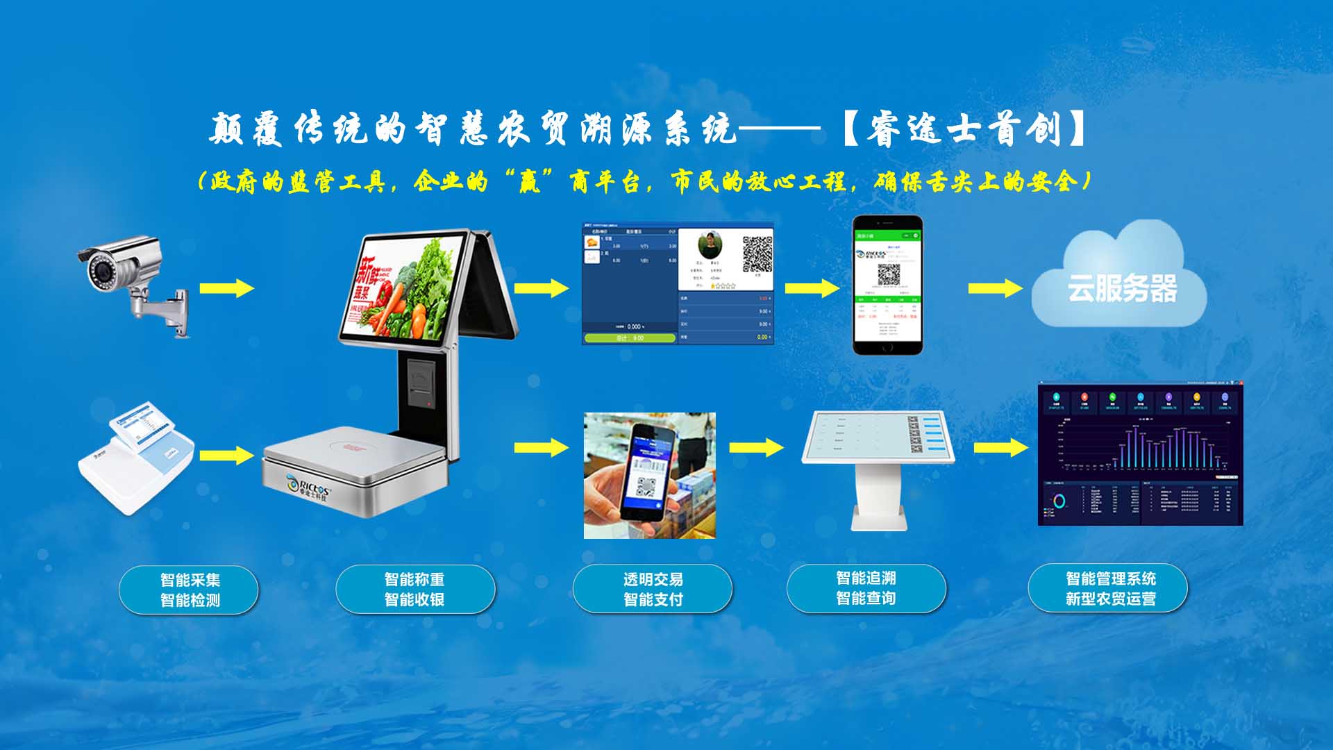 創(chuàng)新實(shí)現(xiàn)了【智慧農(nóng)貿(mào)溯源管理系統(tǒng)】與【智能稱(chēng)重收銀】一體化解決方案,集市場(chǎng)管理、運(yùn)營(yíng)管理、溯源追溯、智能收銀大數(shù)據(jù)運(yùn)用于一體,硬件、軟件與管理系統(tǒng)完美結(jié)合。適用于農(nóng)批、農(nóng)貿(mào)市場(chǎng)蔬菜、生鮮、水果、水產(chǎn)、肉類(lèi)、熟食等稱(chēng)重和非稱(chēng)重銷(xiāo)售;由于采用一體化設(shè)計(jì),解決了傳統(tǒng)農(nóng)貿(mào)市場(chǎng)無(wú)法實(shí)現(xiàn)的信息化、智能化、可追溯的管理問(wèn)題;使稱(chēng)重、收銀、追溯、管理、更透明、公正、安全,讓顧客無(wú)后顧之憂,給管理工作帶來(lái)極大的便捷與高效,對(duì)國(guó)內(nèi)農(nóng)產(chǎn)品行業(yè)的發(fā)展、農(nóng)產(chǎn)品流通管理起到了典范作用。 【睿途士首創(chuàng)】顛覆傳統(tǒng)的“智慧農(nóng)貿(mào)市場(chǎng)系統(tǒng)”,解決了傳統(tǒng)農(nóng)貿(mào)系統(tǒng)單一安卓掛屏,昂視不方便看、不直觀、無(wú)互動(dòng)性,傳輸信息不齊全、不穩(wěn)定的問(wèn)題,也解決了按鍵電子秤商品難找、商品代碼難記、按鍵操作不靈活、支付不智能,對(duì)收銀管理、銷(xiāo)售商品、菜名、菜價(jià)、打折、優(yōu)惠、會(huì)員、線上下單、采購(gòu)等無(wú)法實(shí)現(xiàn)實(shí)際菜品交易和追溯等問(wèn)題。 更具顛覆性的是睿途士智慧系統(tǒng)擁有三大管理平臺(tái)(市場(chǎng)管理平臺(tái)、總部運(yùn)營(yíng)管理平臺(tái)、商戶后臺(tái)管理平臺(tái))、一個(gè)可視操作前臺(tái)和三大追溯功能,讓遠(yuǎn)程管理、數(shù)據(jù)傳輸、人機(jī)互動(dòng)、智能控制、移動(dòng)支付、大數(shù)據(jù)、互聯(lián)通信、云端存儲(chǔ)、人工智能、智能城市、電子定位、智能收銀等功能得以實(shí)現(xiàn)。